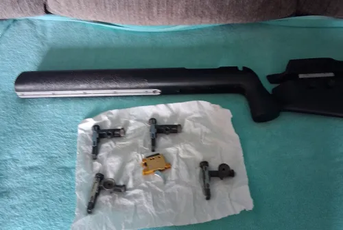 350.00 Rifle stock/and sites Apr 20, 2026 - 12:58 PM Mark LIVELY McMillan rifle stock left handed 2 central sites/ 2 Lynx sites