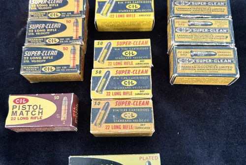 120.00 Vintage 22LR CIL Canadian Industries Limited 12 boxes Feb 27, 2026 - 10:11 PM Andys124 Available is some vintage CIL 22s. 12 assorted boxes from different decades.