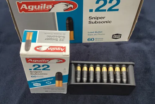 125.00 Aguila Sniper Subsonic 22LR full brick Mar 5, 2026 - 10:44 AM Andys124 Harder to find currently. A full brick of Aguila Sniper Subsonic 22LR.