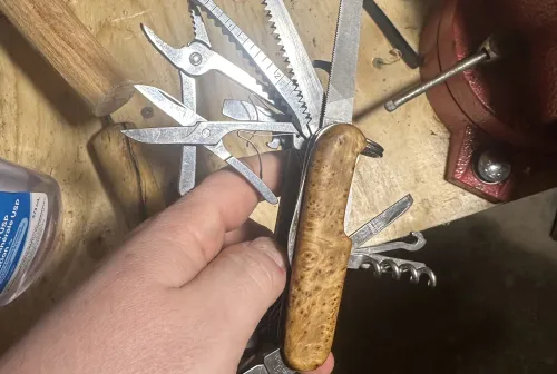 150.00 Victorinox Swisschamp Jan 28, 2026 - 6:39 PM RamNed Got a swisschamp with Karelian Birch burl scales I put on