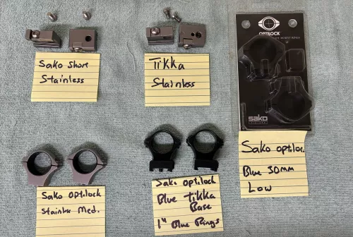 90.00 Sako Tikka Optilock rings bases Oct 27, 2025 - 1:04 PM Hundmeister Sako Tikka Optilock rings and bases. $90 per set rings or bases.