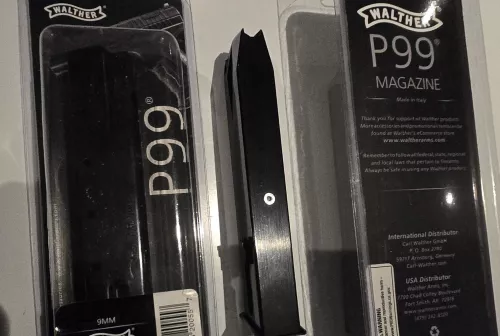 98.00 Walther OEM P99 9mm 10/20 Mags Oct 16, 2025 - 1:14 AM Ammunation Walther OEM P99 9mm 10/20 Mags. Made in Italy. $98 each.