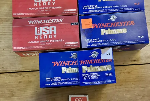 505.00 PRIMERS! (Mostly Winchester) Large, small, pistol, rifle, standard & magnum Feb 27, 2026 - 5:13 PM GunSlinger.44 PRIMERS! Winchester & CCI primers as follows: