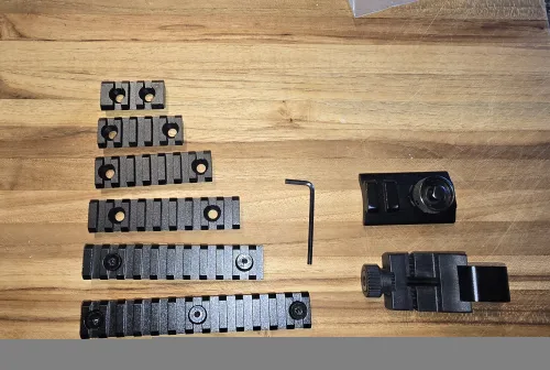35.00 Picatinny rails, flashlight mount, swivel/bipod adapter Mar 7, 2026 - 6:47 PM RugerRoegy 6 assorted M-Loc Picatinny rails 1 flashlight Picatinny mount 1 inch Dia.