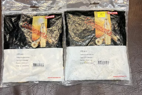 150.00 6.5 Grendel NORMA brass Oct 7, 2025 - 6:25 PM REMINGTON JIM 2 New bags of Excellent Quality NORMA 6.5 Grendel brass ! 100 lot in each bag 👍