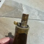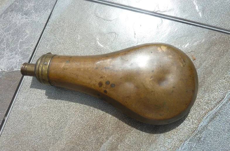 This is common size flask for servicing a rifle or fowler. Seams are all-intact and the dispensing valve works correctly.