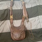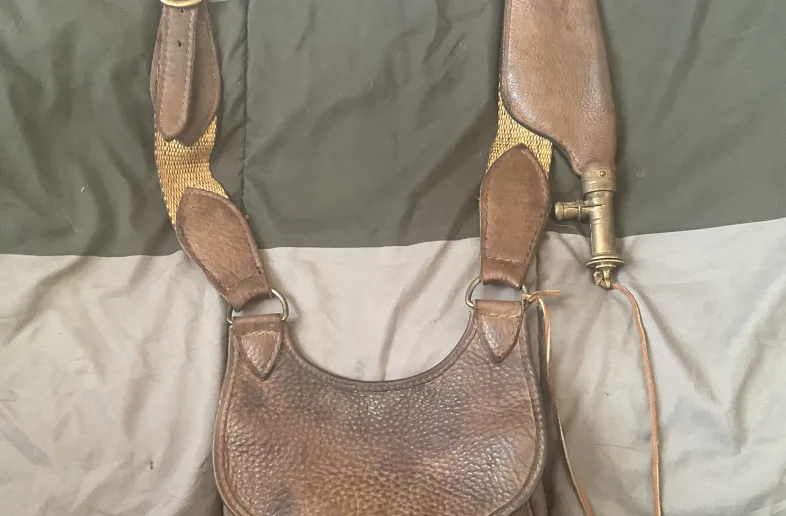 This was my smooth bore possibles bag It’s a quality bag from the leatherman at blackpowderbags.com it has a shoot bag with Irish charger head sewn to the strap which also holds the short starter. The charger head retaining spring is broken so I attached it to a lanyard so it won’t get lost if it falls out or you can keep it in the possibles bag. Dixie gun works has a replacement spring. The charger head is adjustable for the amount of shot. This bag can be used for both patched round ball or bird shot at the same time. Short starter not included unless requested by buyer.