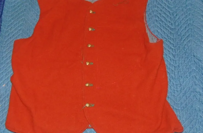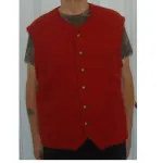 1 mountain man / buckskinner style red blanket wool vest about size 42 chest has lining and 6 brass buttons with 1 hidden inside chest pocket .( i am 42 chest 40 waist 5ft 11 tall the vest fits me loose and comfortable ...........may be adjusted by re sewing buttons i think slightly larger or smaller.
