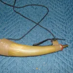 1 powder horn with brass stopper about 9 inch long by 2 inch wide at rear.