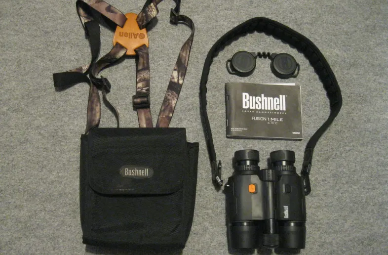 One only used Bushnell Fusion 1 Mile Rangefinder Binoculars 8X32mm. Everything in the pics are included (note-missing front lense caps). These binos have served me well and are fully functional. I have ranged out to over one mile with these and I find the glass to be very clear. There are some very fine lines on the front objective lenses from using an abrasive material (kleenex) to wipe dry in the field but it doesn't effect the function or clarity of the binos. $499 shipped FIRM. Please don't text my landline #.