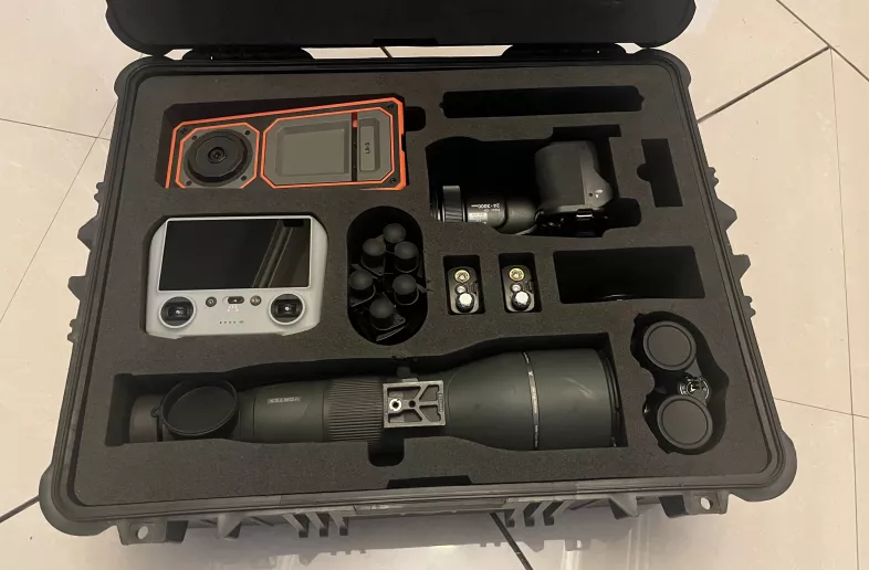 Here’s a custom made kit in high density foam neatly organized in a cad program to maximize storage space. This kit contains a pair of fury range finding binoculars, no A/B. Vortex razor straight spotter model RS – 85s, comes with mil reticle. A custom built dual optic mounting plate for a tripod. Tripod not included. An Nikon P 1000 high zoom camera for filming impacts. Longshot LR3 2 mile camera system. 2 Baofeng GT-3TP 2 way radios. Telescopic wind reading antenna. DJI mini three with fly more package. Please note tripod is not included that shown in the pictures. I’ll also include the umbrella in the one picture as there’s a custom spot for it on the optic mount.