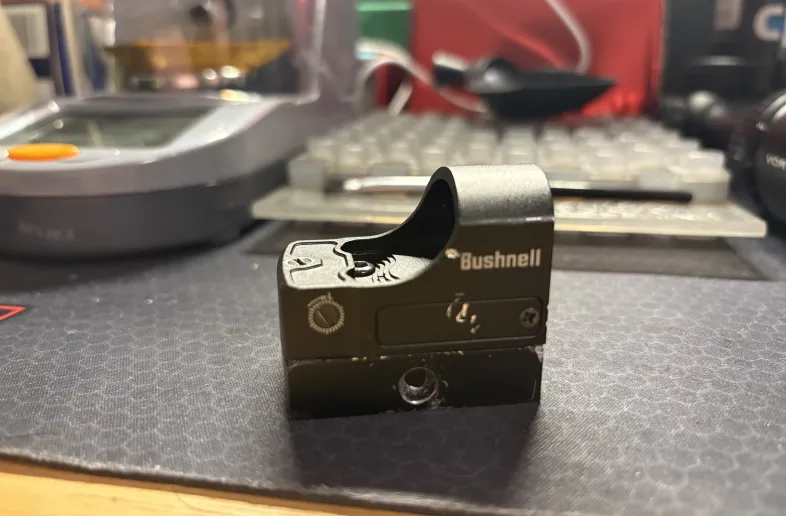 Bushnell reflex/red dot sight. Needs a new mount or mounting screws. No damage on glass, dot functions fine. Some scratches, no dents. Comes with cover and some battery life.