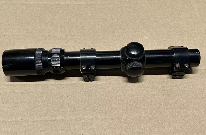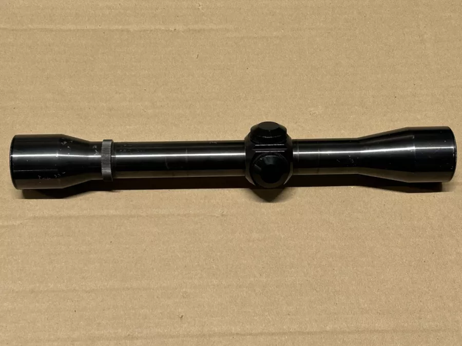 Weaver Marksman 4x. Cannot remember what firearm it was on. Ring marks and scratches but no dents.