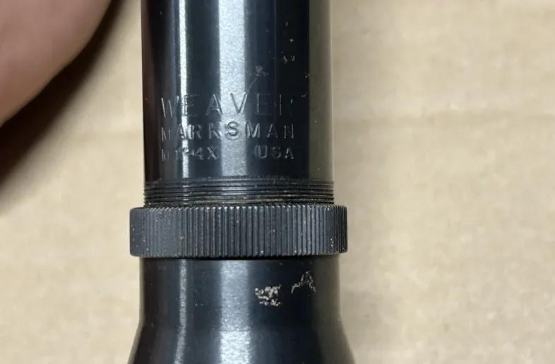 Weaver Marksman 4x. Cannot remember what firearm it was on. Ring marks and scratches but no dents.