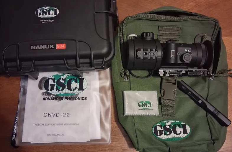Absolutely new condition.This is the real deal tactical clip on night vision device that attaches in front of your day scope this is not some cheap Chinese Digital, this is analog military grade, high-definition, white phosphorus. With quality quick release, mount. Night vision. Absolutely, awesome. Turns night into day. Extremely low hours. One battery lasts over 50 hours And still under warranty until 2028