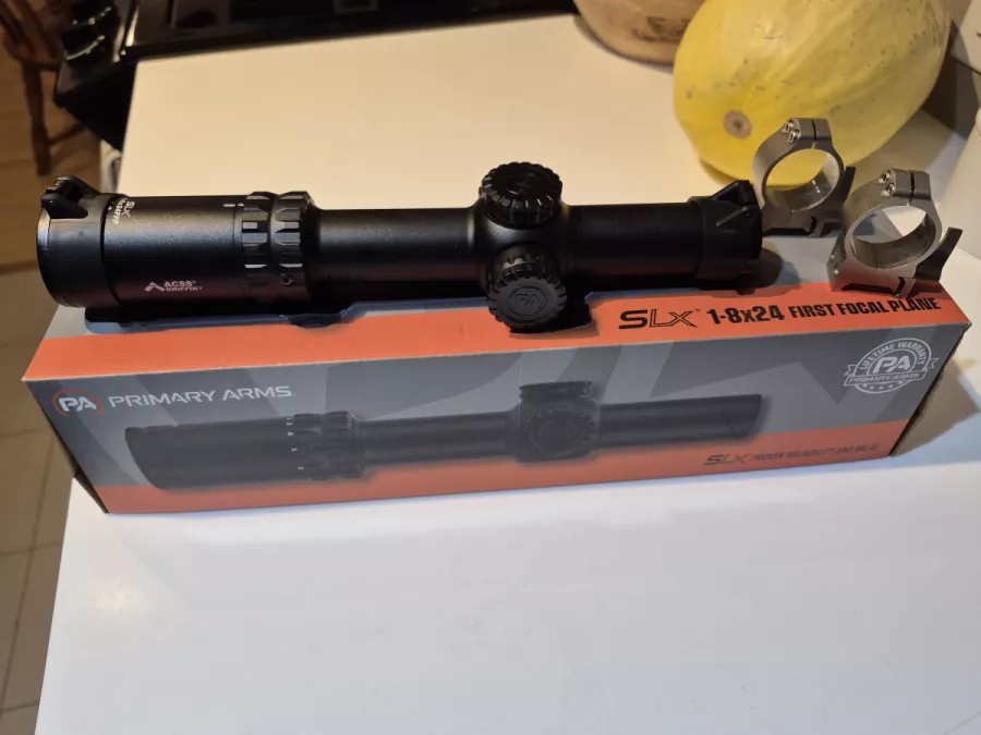 Primary Arms 1-8 FFP, SLX, grif-x-mil reticle, with Warne QD rings, and lense caps