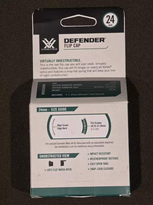- Vortex Defender Eyepiece and 24mm Objective Flip Caps.