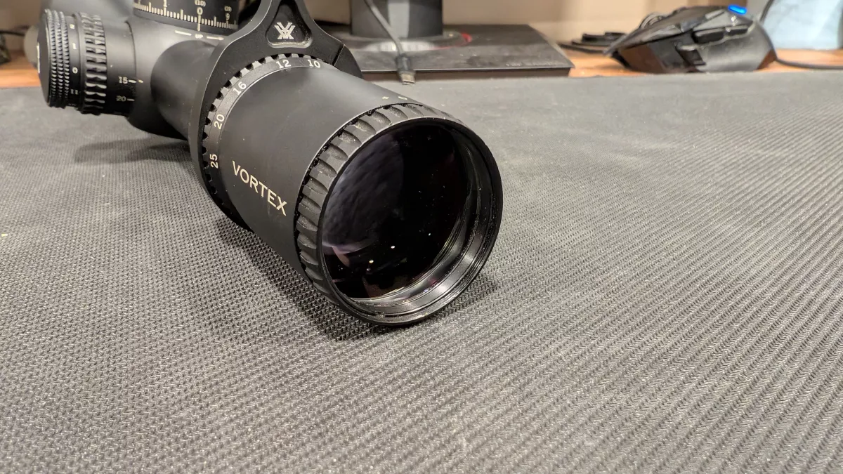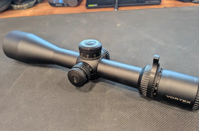 Vortex strike eagle 5-25x56 MRAD, used on a 22lr, everything works great! The parallax and magnification move buttery smooth. Glass is crystal clear with no scratches on the ocular or objective lens. Comes with throw lever, sunshade, zero stop(installed in the turret), rubber lens covers, turret key tool, and in original packaging and box. Scope has locking turrets and an illuminated reticle (has battery installed). Buyer pays shipping.
