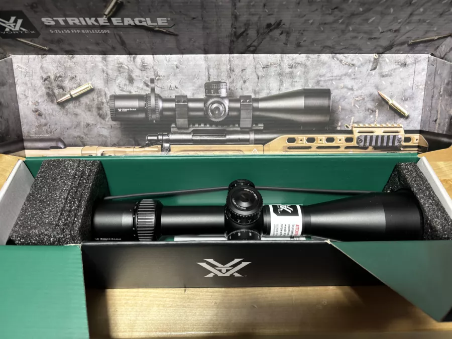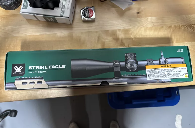 Brand new never mounted, Vortex Strike Eagle 5-25x56 everything you get when new including the sun shade, throw lever, cloth, zero stop piece, and tool. This was a replacement for a scope I sent in for warranty and asked for a MRAD version as I am switching over to it from MOA, but bought some new glass and now need to recoup my investment.