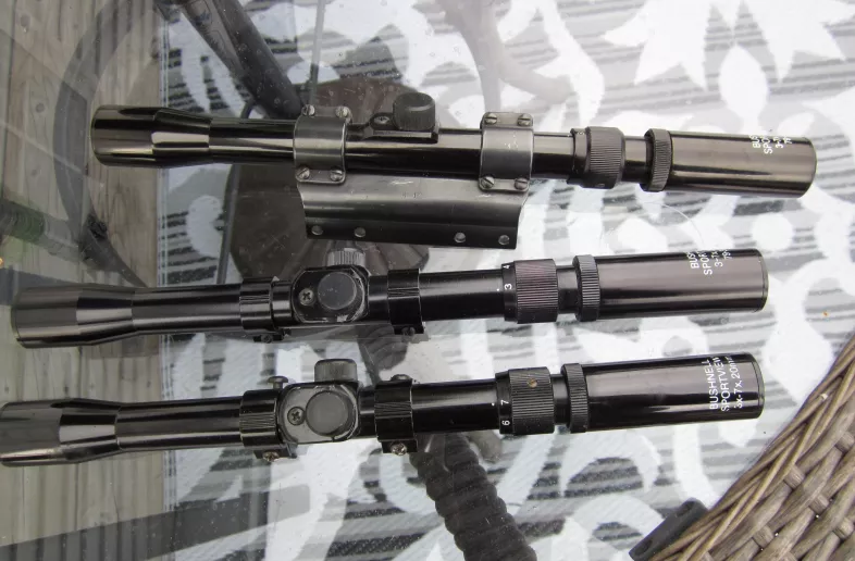 Have 3 Bushnell Sportview .22 or pellet gun scopes 3-7x. Two with clamp on aluminum rings for 3/8 inch dovetail, one with a Weaver N1 side mount. All have duplex recticle, one with side mount is tv screen type lenses. Selling all three together for $85 shipped.