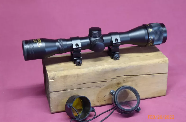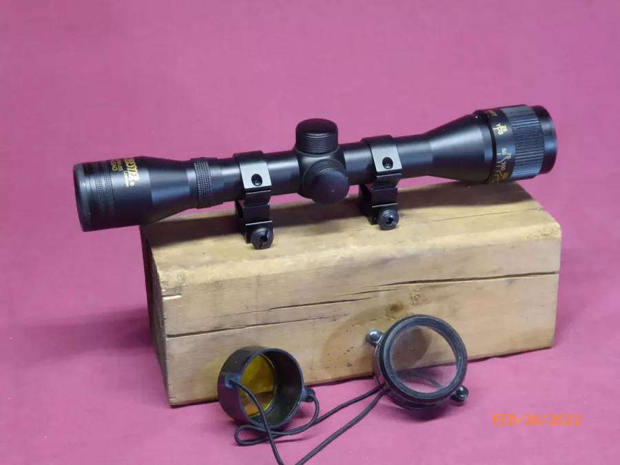 Winchester 4x32 AO air/rimfire rifle scope, Adjustable from infinity down to 25 yds, 55', 30', etc. 1” aluminum tube, Duplex cross-hair reticle, clear and bright, complete with rings and mounts for 3/8”/11mm dovetails. includes see-though lens covers, Fogproof and shock resistant.