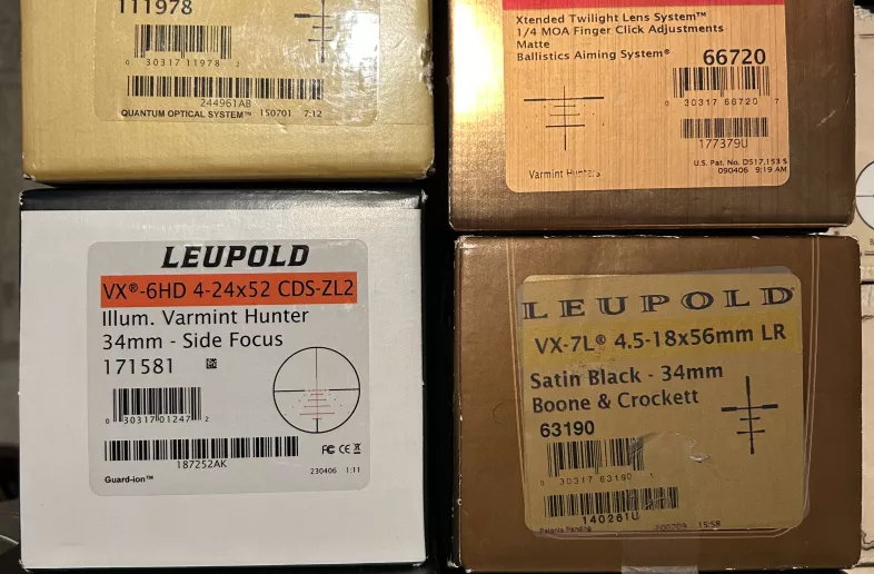 Looking for scopes in the configured photos… As well as both a 4.5 -14 x 50 Crockett and long range hunter in a silver finish! Vx6 hd 2-12x42 Boone & crocket, vx7 long range hunter 56mm and 4.5-14x56mm vx3L long range hunter! Please contact me through the messenger to avoid scammers! Thanks
