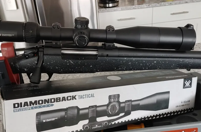For sale is a nearly new Vortex Diamondback Tactical 4-16x44 MOA with new Warne rings, flipcaps, sunshade and box. On my 30-06 for 3 shots to sight in only. Everything is perfect on it. I am simply deciding to go to Mils. Glass is perfect and crystal clear and so is the rest of scope.