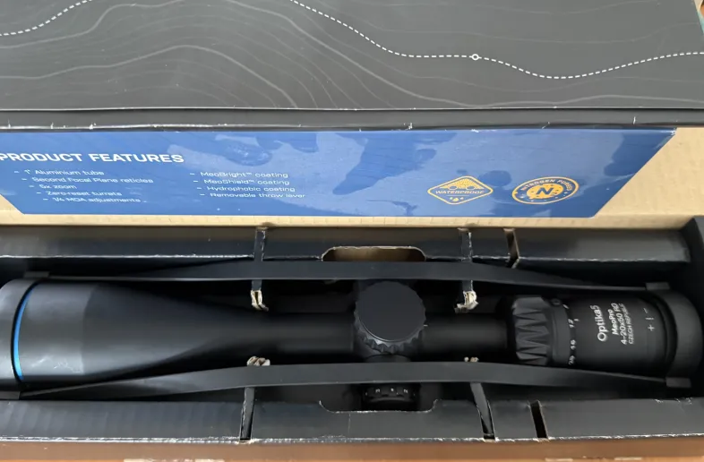 Features: 5x zoom, parallax adjustment, 3.62 eye relief, 10 step adjustable red dot adjustment to match ambient light with off position between each step, second focal plane, etched reticle.