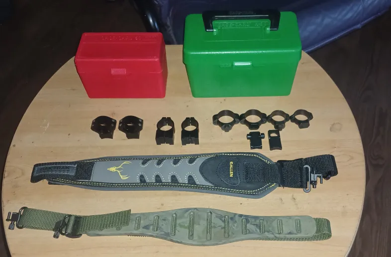 2 shoulder strap $10 et $20 -----2 box ammo $5 and $10-----x-bolt rings 1 po black $40 -------x-bolt ring burnt bronze 1 po $80 ----warne specific ring 1 po for tikka $50----leupold standard browning BLR base and 2 set of ring 1po et 30mm medium $70---or $200 for both shipped