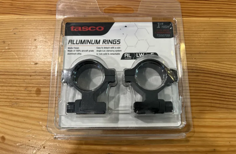 Brand new Tasco Aluminum Scope Rings for .22 Rifles with Tip off or dovetail grooves. These are high style rings for 1” scopes. $10