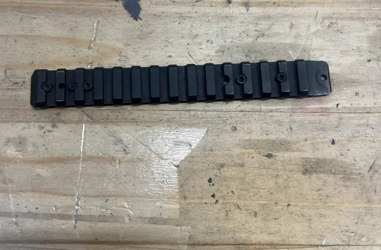 Factory rail. Ground off the front lug to get scope lower. Works as it should and comes with all 5 screws. Pictures say it all. Firm on price, and can ship for about $15 in a bubble envelope or possibly less if through the regular mail system (that wont be tracked then though fyi).