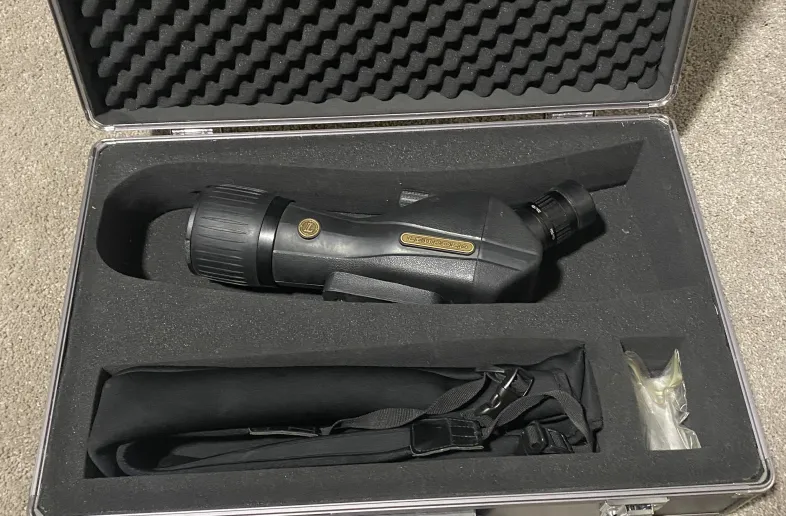 Included hard briefcase, neoprene carrying case and snap cap for objective lens.
