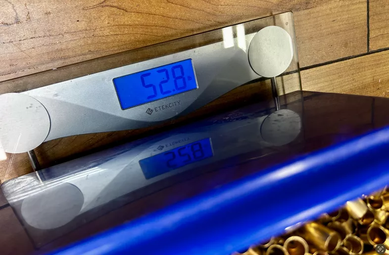 53 pounds of 9mm brass. About 113 pieces per pound gives 5989 pieces.