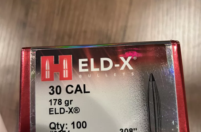1 unopened box of 100, Hornady 30 CAL bullets. 178 GR, .308”, ELD-X