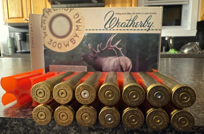Weatherby 1x fired brass for sale. 34 pces all shot from same rifle. One box of select and the rest from the box with an elk. Caliber is 300 wby magnum. Will ship.