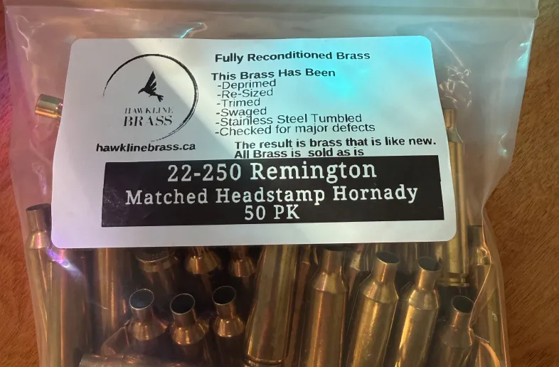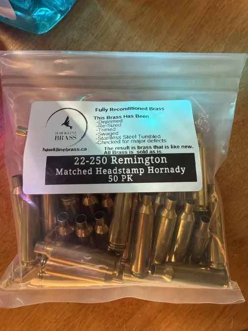 Selling new pack of Hornady 22-250 brass. Contains 50 pieces. Was purchased from hawkline brass a while back and ended up selling the rifle it was meant for. Call or text 780-305-8796