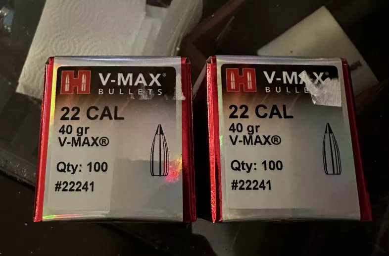 2 x 100 rd boxes of Hornady 22 cal Vmax 40 gr bullets.