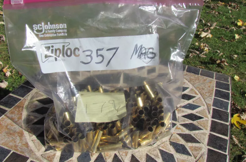179 357 Magnum once-fired brass casings with mixed head stamps. Cases have been tumble-polished, and de-primed. $55.