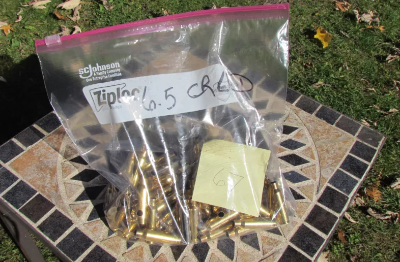 Sixty-two (67) 6.5 Creedmoor once-fired brass casings with mixed head stamps. (Some nickel cases.) Cases have been tumble-polished, and de-primed. $55.