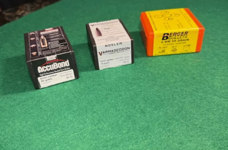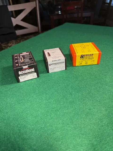 3 misc full boxes of 6 mm projectiles. 1 box Nosler accubond 90 grain , 1 Box Nosler Varmageddon 70 grain, 1 Box Berger 95 grain classic hunter. Package deal preferred EMT Shipping at buyers expense. $200.00