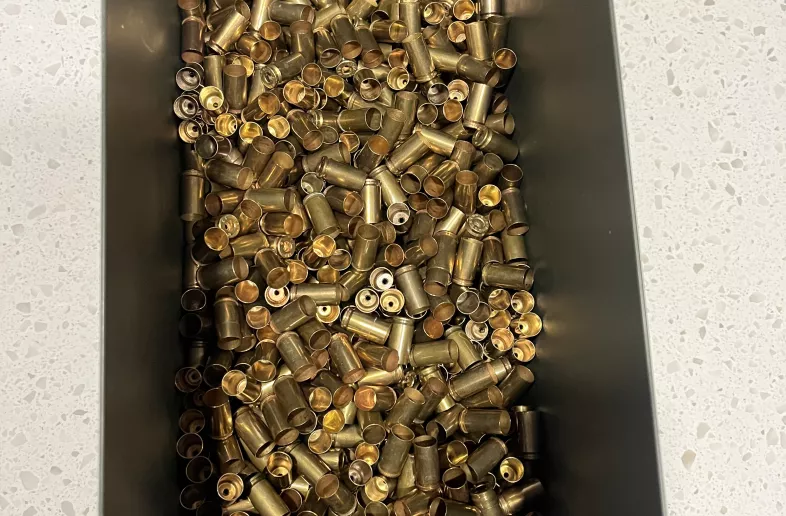 Miscellaneous brands. All once fired, cleaned and deprimed. Hard to tell how many but it weighs 17 lbs with the ammo can. So about 12 lbs of casings.