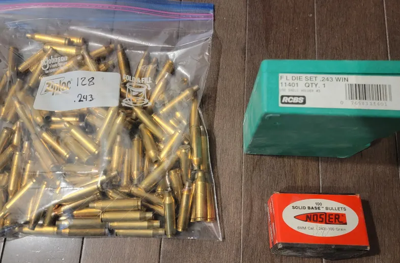 Have 128 once fired brass with a set of never used RCBS dies and box of nosler .243 100gr bullets
