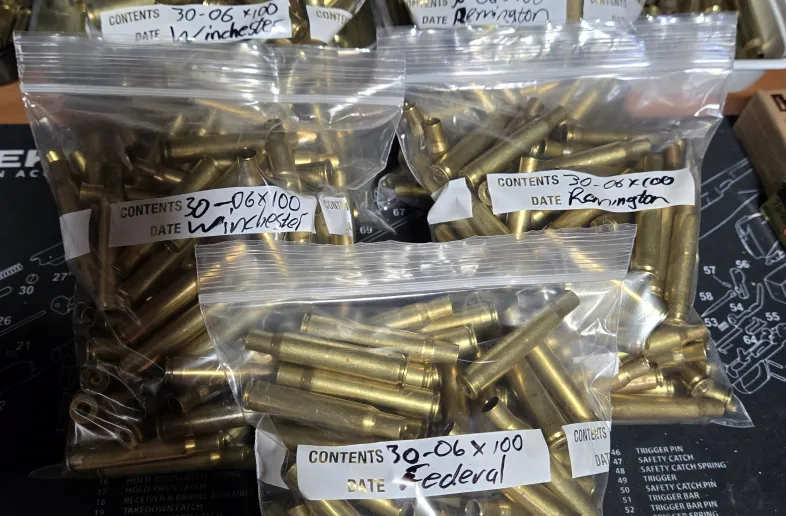 I have 500 30-06 cases, $40/100: 200 Winchester (100 SOLD), 200 Remington, 100 Federal. Cases have been cleaned, full length resized, and trimmed to length if necessary. All you need to do is prime, drop in a powder charge and seat a bullet. $40/100. Will ship on the buyer's dime, but be aware that shipping will be between $20 and $30, depending on location.