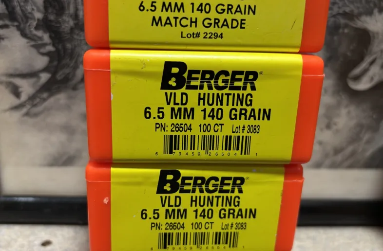 4 boxes of Berger VLD Hunting bullets, 6.5 mm, 140 gr. Price per box $85.00.