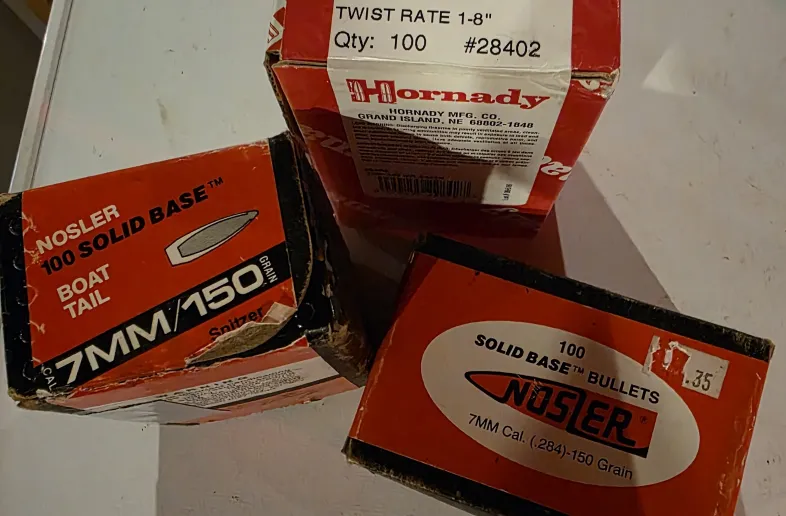 Brass 45 acp , and.309 sized and gc, .375/ 38-55 bullets , all linotype , push them hard .7 mm Hornady 162 A-Max and 7 mm Nosler Ballistic tip 150 g
