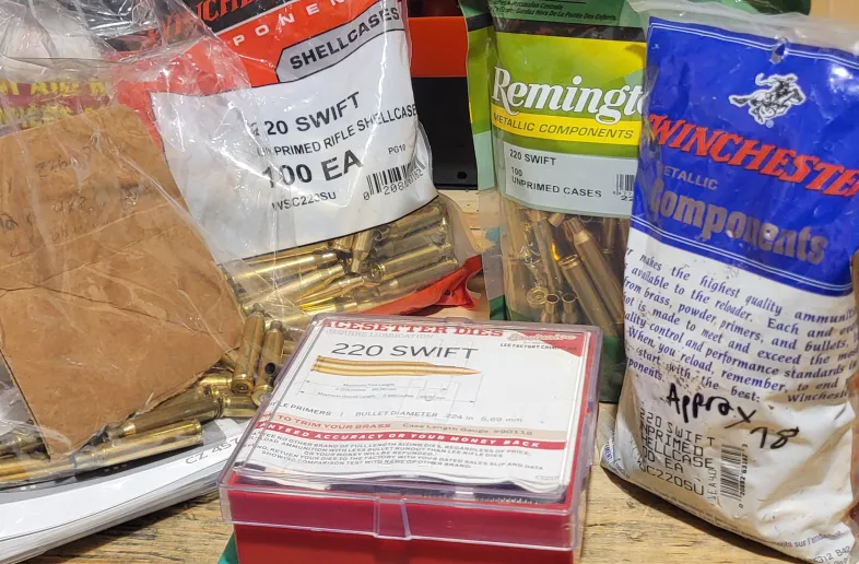Lots of 220 swift brass. Over 250 new and I have lots of 1x fired (not shown).