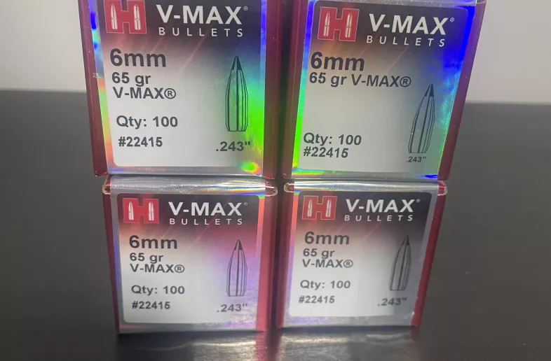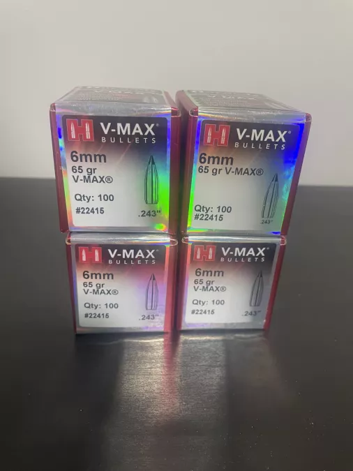 For sale. 4 unopened boxes of Hornady Vmax 65 grain bullets for .243. $60 each. Shipping extra. Prefer local sale.
