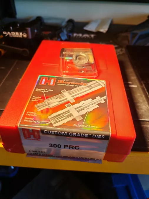 Unused Hornady Custom 300PRC die set and an extra Hornady Micrometer seating die. Comes with two cartridge adapters