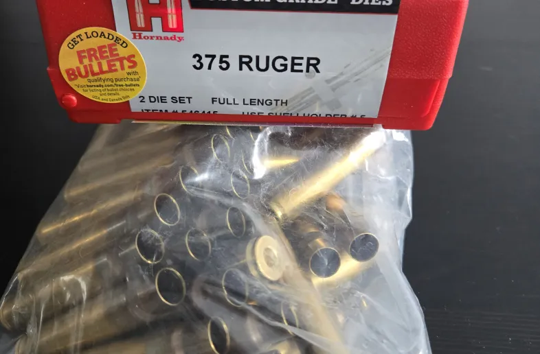 375 RUGER FL.DIES &NEW BRASS 94COUNT SIZE AND TRIMM RADY TO REALOD
