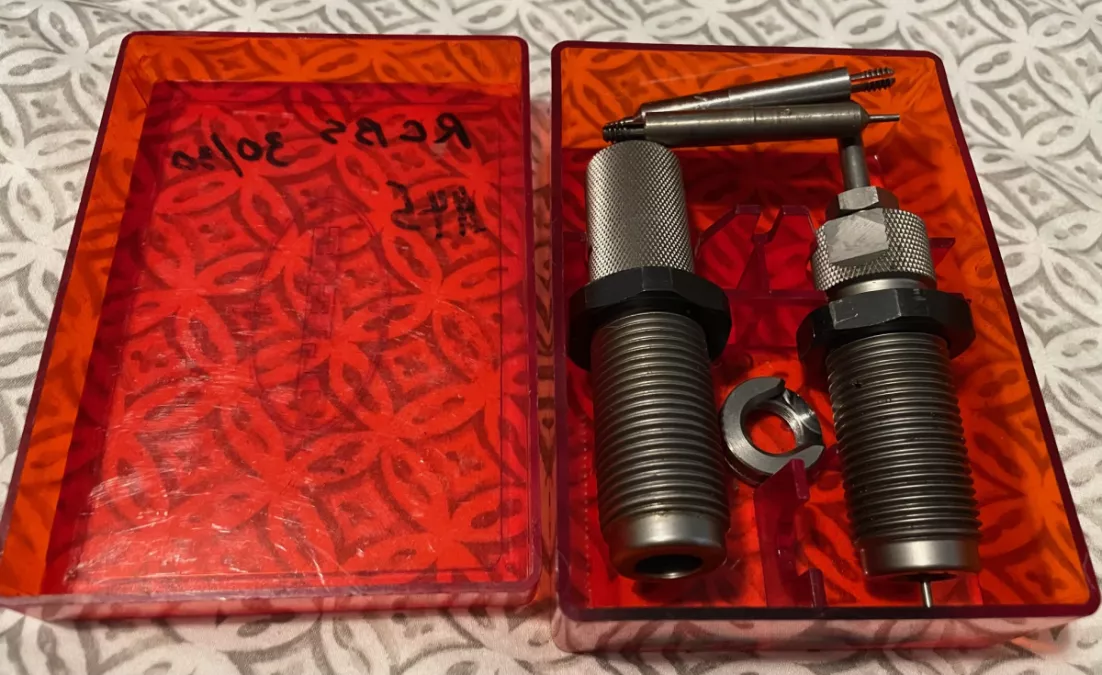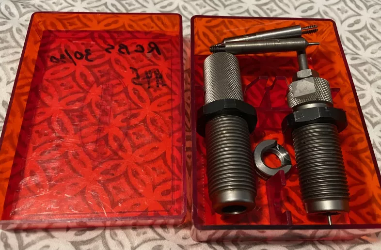 RCBS (Red Box) .30-30 D2-die set with TWO sizing pilots for Lee hand trimmer. $60
